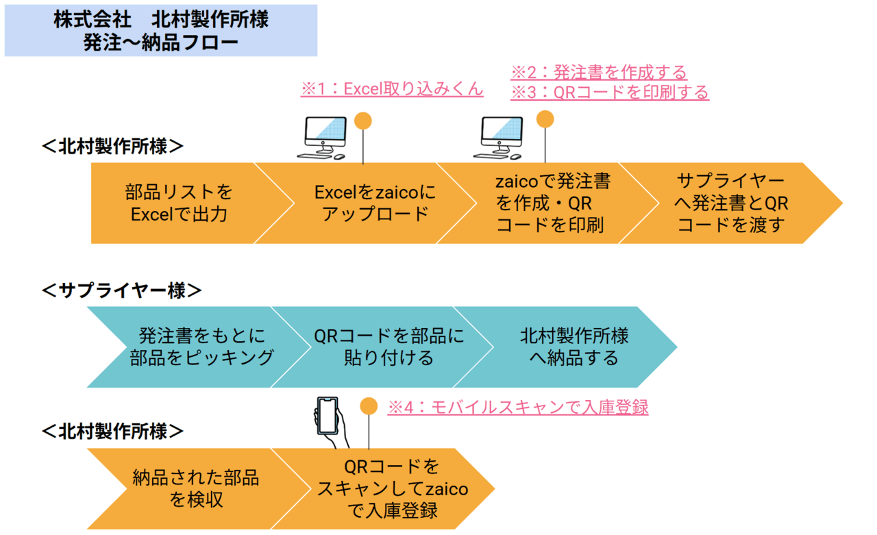 - 続いて、発注書をzaicoで作成し、各部品に紐づくQRコードを印刷してシール化したものと一緒にサプライヤーへ渡します。このQRコードシールをサプライヤー側で部品に貼って納品してもらい、検収時にスマホでスキャンして、入庫登録をしています。
