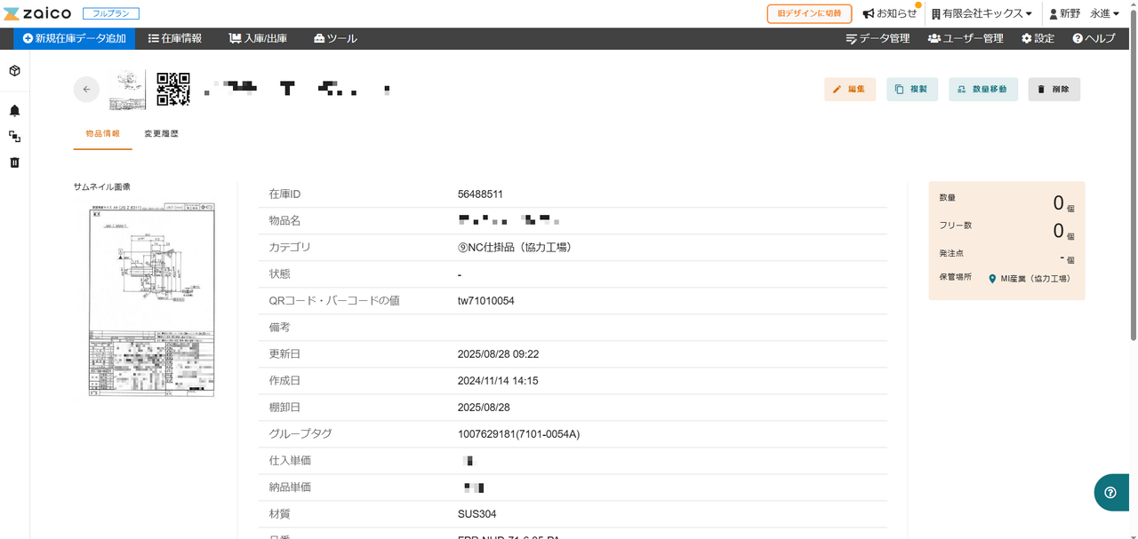 新野様:zaicoには、一つの物品を製造工程ごとに分け、別の在庫データとして登録しています。こうすることで、工程ごとの在庫数や状態を正しく把握できるようになるためです。