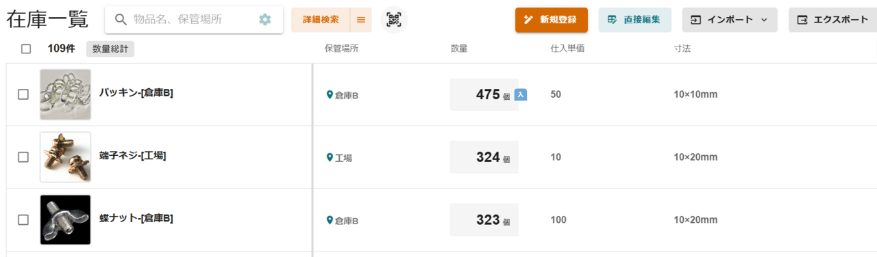 QRコード/バーコードスキャン / 画像登録 / 項目追加 / 保管場所登録 / 絞り込み検索 / 数量移動