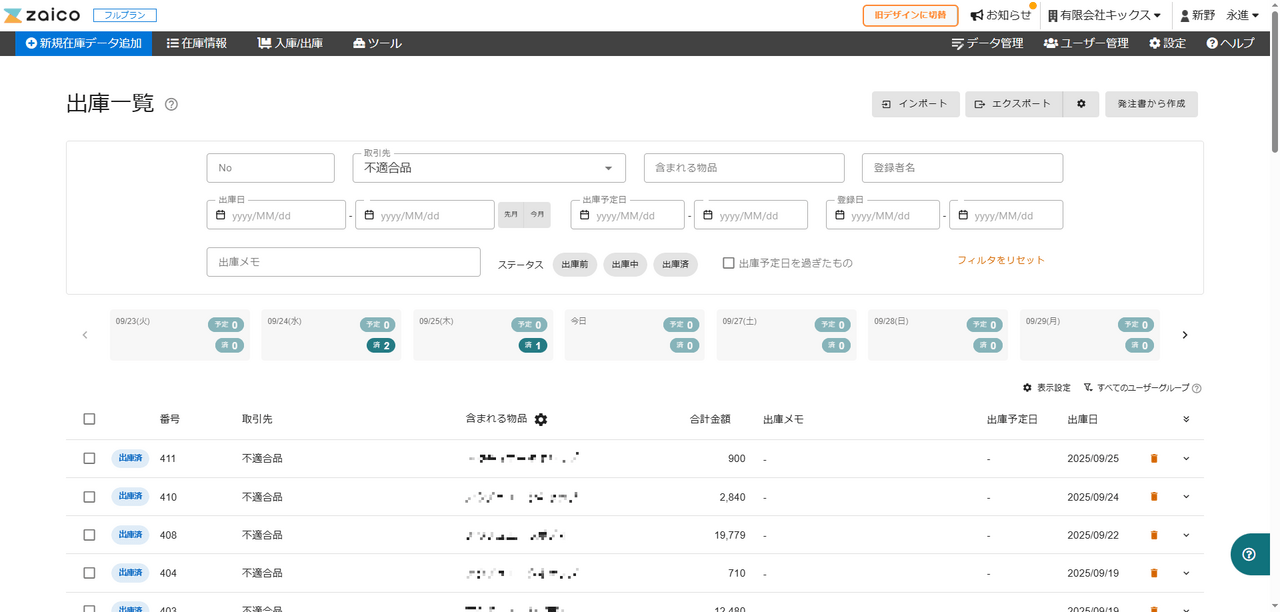 キックス様の出庫データ一覧。取引先は「不適合品」