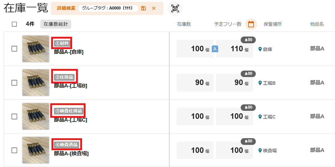 また、すべての「部品A」の在庫データに「グループタグ」として、「部品A」に紐づく品目コード・品番も登録しています。こうすることで絞り込み検索などがしやすくなります。