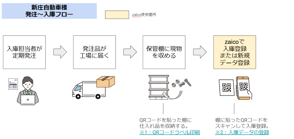 杉山様:発注担当者が定期的に発注をかけ、商品が届いたら、QRコードが貼ってある棚に現物を収めます。このときにzaicoで入庫登録をします。