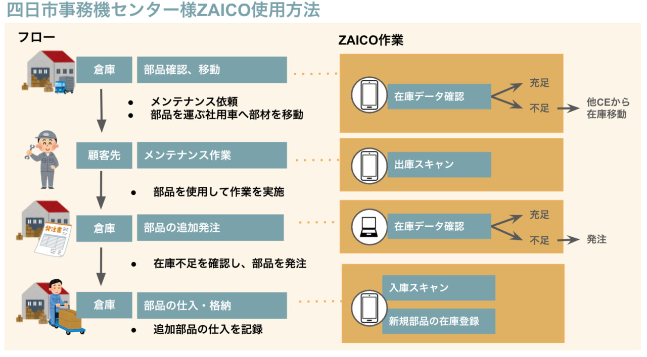 在庫管理のフローですが、CEが各自zaicoの出庫スキャン機能を使って、メンテナンス先で使った部品の在庫数を減らします。(※1)