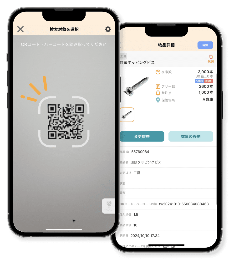 モバイル端末で物品を撮影すると、撮影した画像をAIが自動で識別。すばやく該当の在庫データを検出し、すぐに在庫データの操作ができます。
