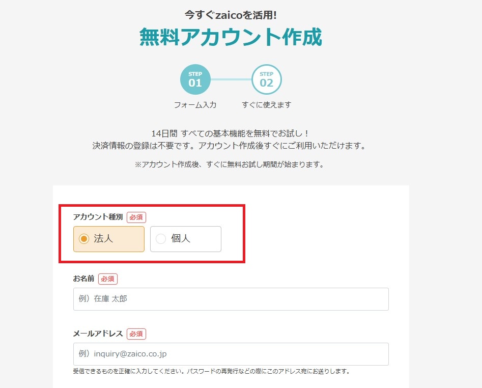 デフォルトで法人にチェックがついておりますので、個人の方は個人を選択してください。