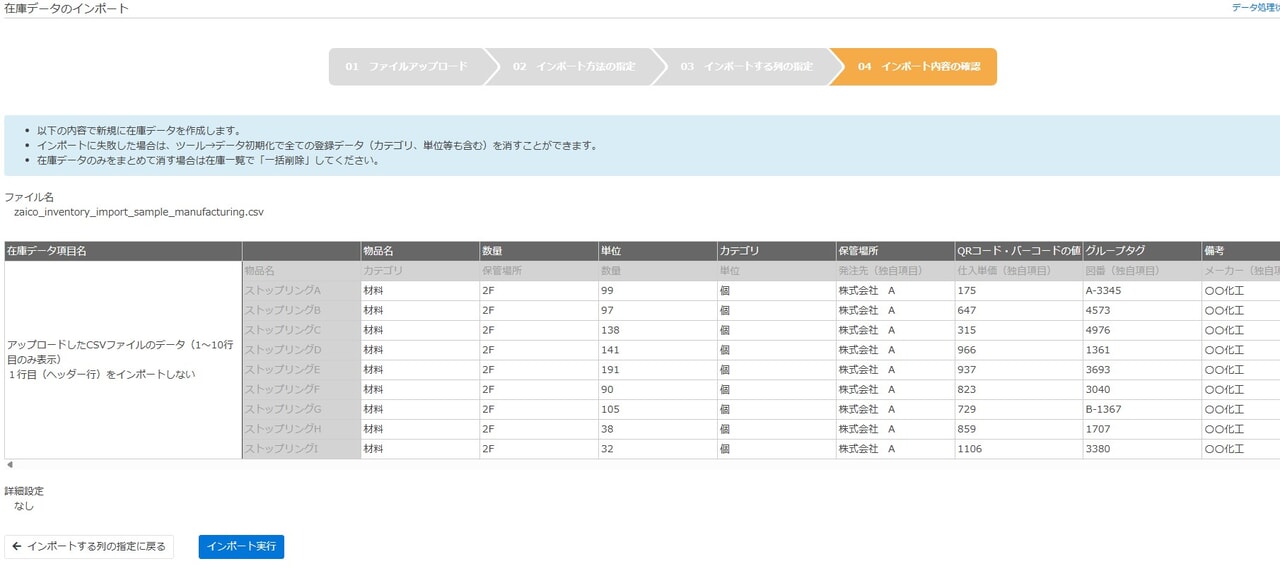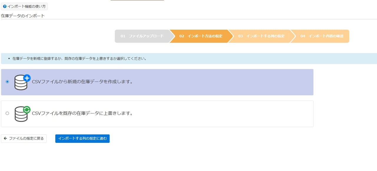 - CSVファイルから新規の在庫データを作成します。