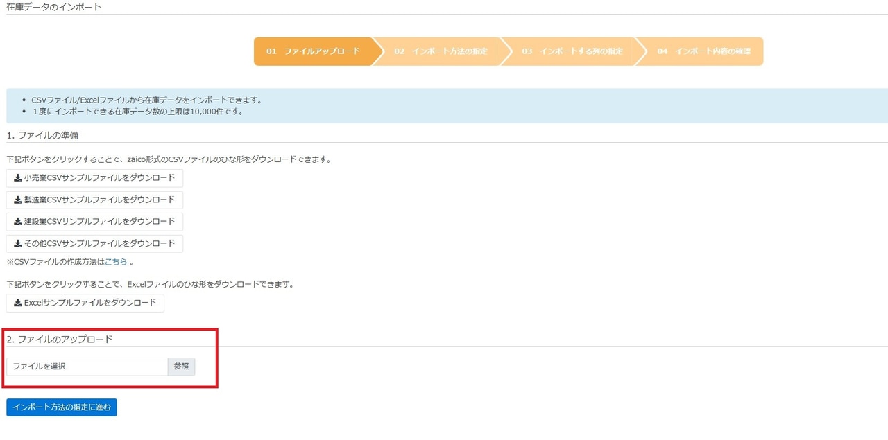 「1. ファイルの準備」の項目があり、こちらの画面からCSVファイル・エクセルファイルのサンプルをダウンロードができます。
