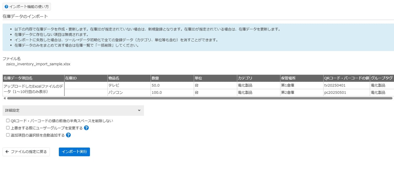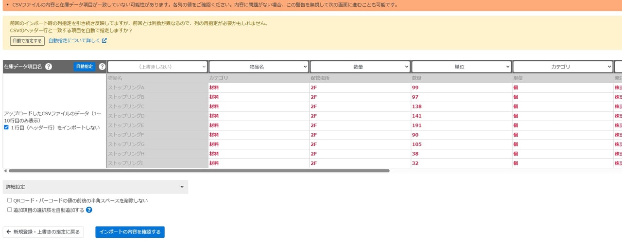 - CSVファイルを既存の在庫データに上書きします。